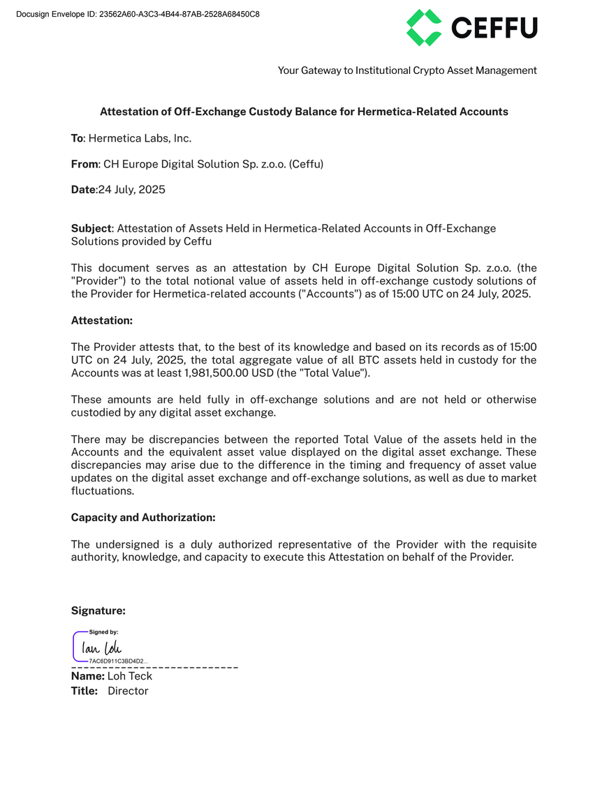 $1,981,500.00 has been verified to be held within solutions offered by Ceffu as of 15:00 UTC July 24th, 2025, including unrealized P&L.