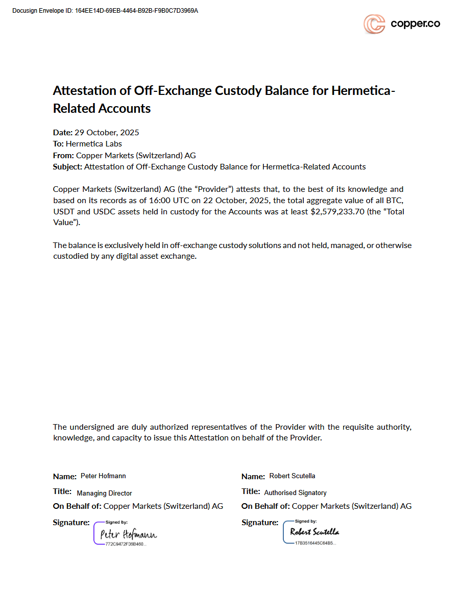 $2,579,233.70 has been verified to be held within solutions offered by Copper as of 16:00 UTC October 22, 2025, including unrealized P&L.