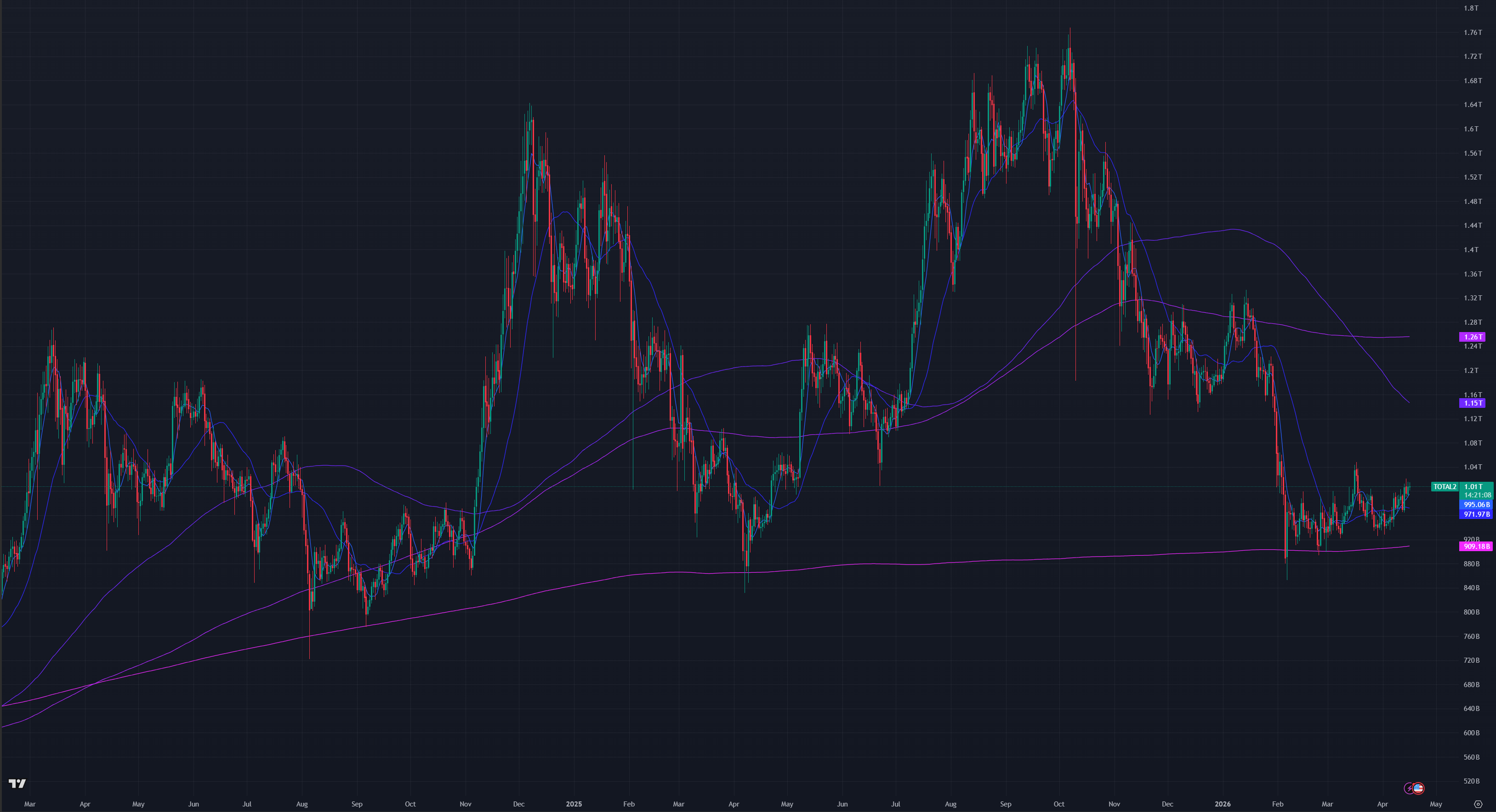 Figure 2: Crypto Market Cap Excluding Bitcoin, Daily Candles, & Moving Averages; 2 years