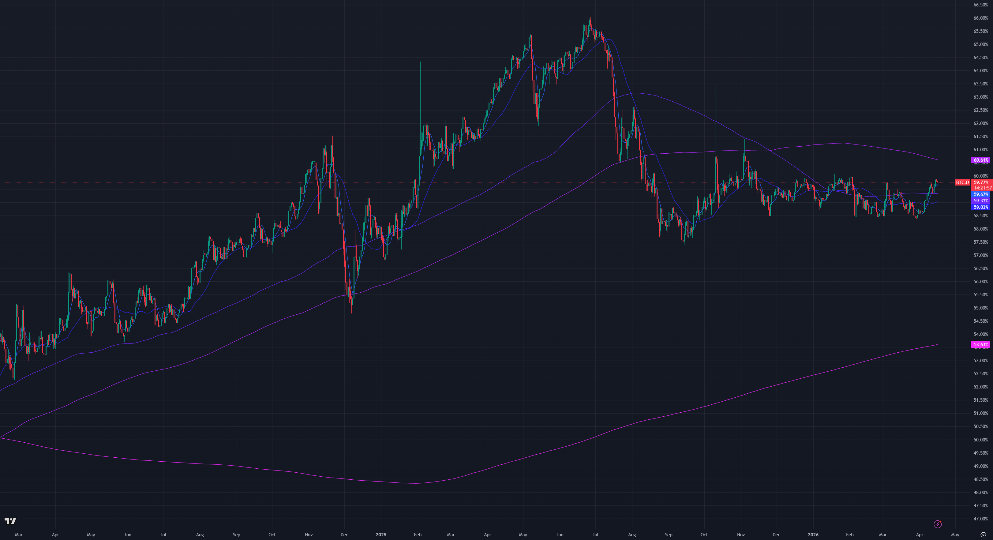 Bitcoin dominance rose to 59.77% from 59.47% last week