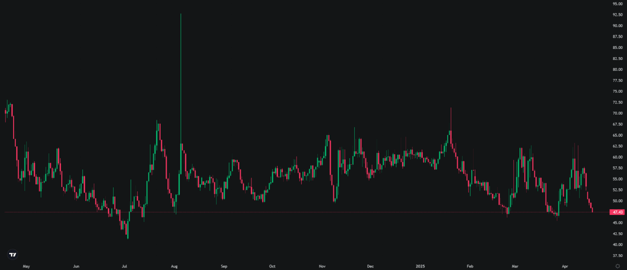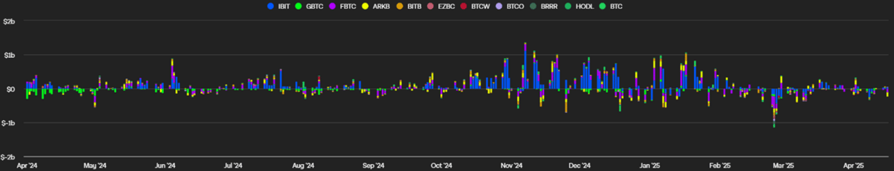 Net outflows since Friday, March 28, totaled $12.7 million. Daily net flows have remained muted throughout the week, with last Friday seeing just -$1 million and Monday recording a modest $1.5 million inflow. Overall, flow activity this week has been the least volatile since the final week of March.