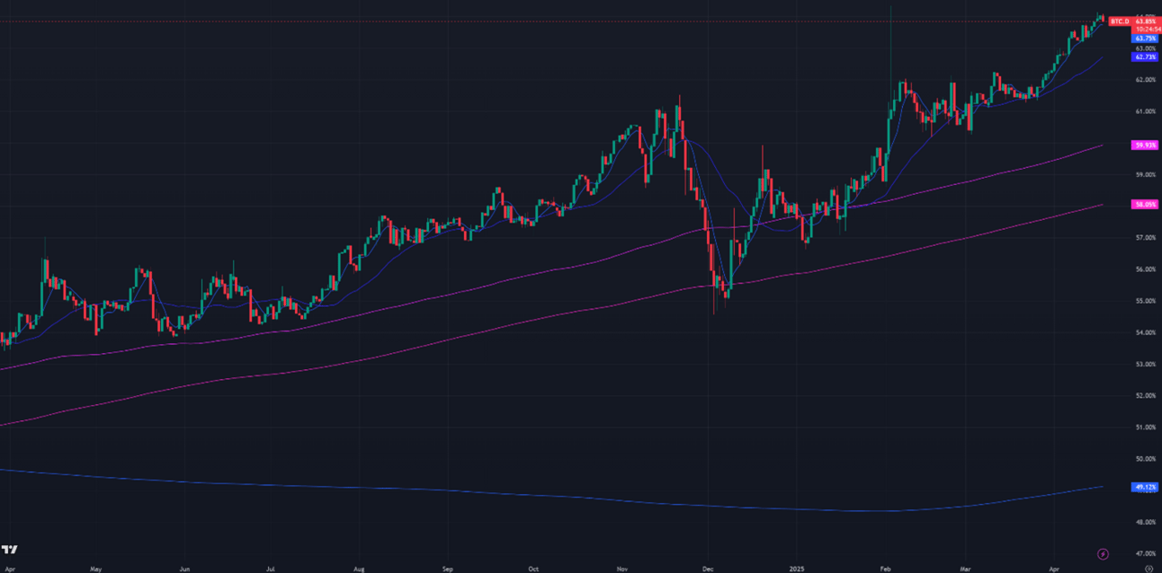 Figure 3: Bitcoin Dominance, Daily Candles, & Moving Averages; 1 year