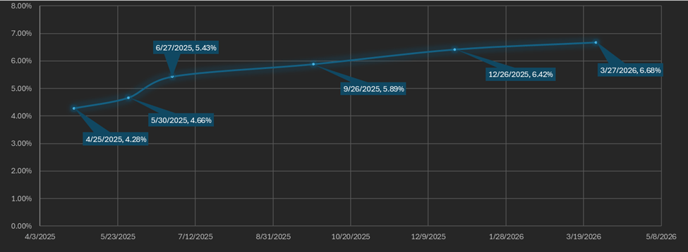 The basis spread, the premium of futures prices over spot, is positive across all maturities. On average, basis spreads rose 1.11% week-over-week, climbing from 4.45% APR to 5.56% APR. The futures curve remains in a typical contango structure, with the front-month contract (April 25) yielding the lowest rate at 4.25% APR, and longer-dated maturities rising from there. The spread between the highest- and lowest-yielding contracts narrowed to 2.4%, down from 6.87% last week, when the front-week maturity briefly dipped to -0.25%.