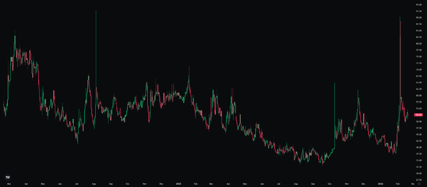 DVOL has moved from 72% to 52.55% but remains above the 35%–42% range seen before the selloff. The February 5 price action took DVOL to 90%, the highest since FTX. DVOL has since cooled, but remains high.