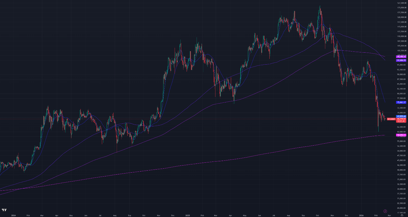 Bitcoin trades below all major moving averages except the 200-week, a key structural support near $58,300. The 180-day and 360-day MAs sit near $97,000–$99,000, and Bitcoin would need roughly a 40% move to reclaim the 180-day MA. The 7-day MA has started to flatten, indicating slower selling momentum. Other support levels are $65,000, $60,000, and $52,000, with resistance at $70,000, $73,300 (20-day Exponential Moving Average), $76,000, and $80,000.