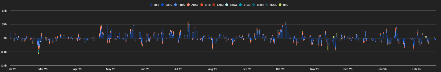 The futures basis has improved from the intermittent backwardation seen in early February. Front-month futures still trade below spot, but the negative basis is smaller than in recent weeks. The average equal-weighted spread is 2.19% APR this week versus 1.85% APR last week. Perp funding, negative during the selloff, has moved to neutral and is now slightly positive, suggesting short pressure has eased and the market is less oversold.