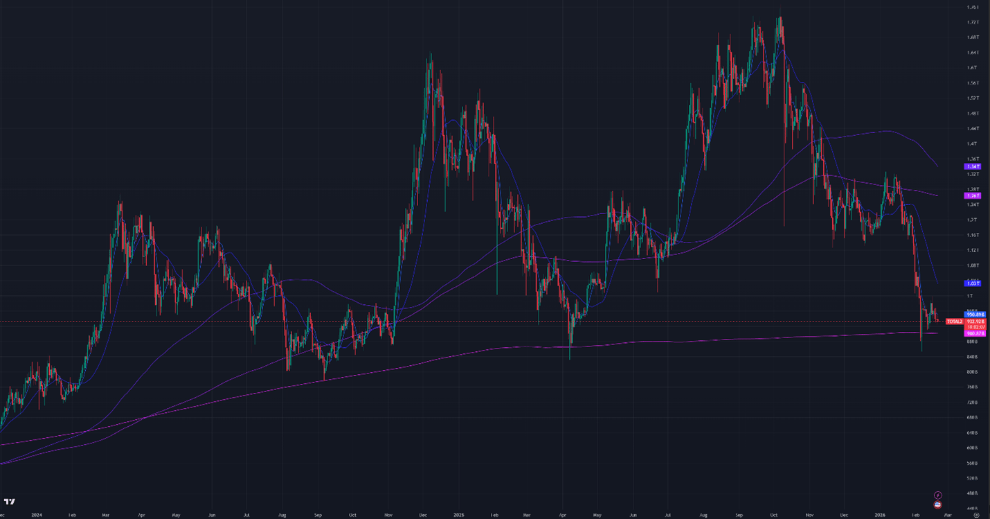 Figure 2: Crypto Market Cap Excluding Bitcoin, Daily Candles, & Moving Averages; 2 years