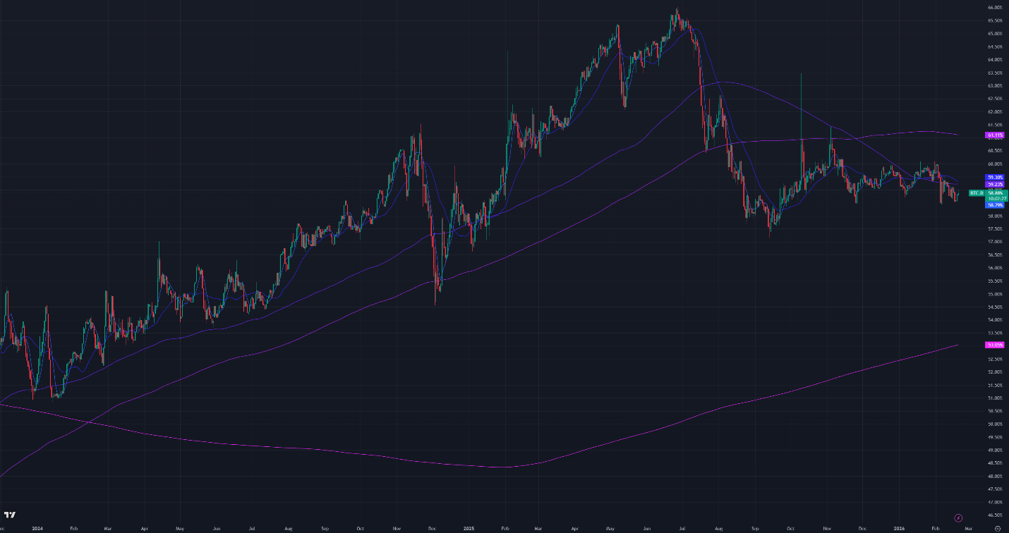 Figure 3: Bitcoin Dominance, Daily Candles, & Moving Averages; 2 years