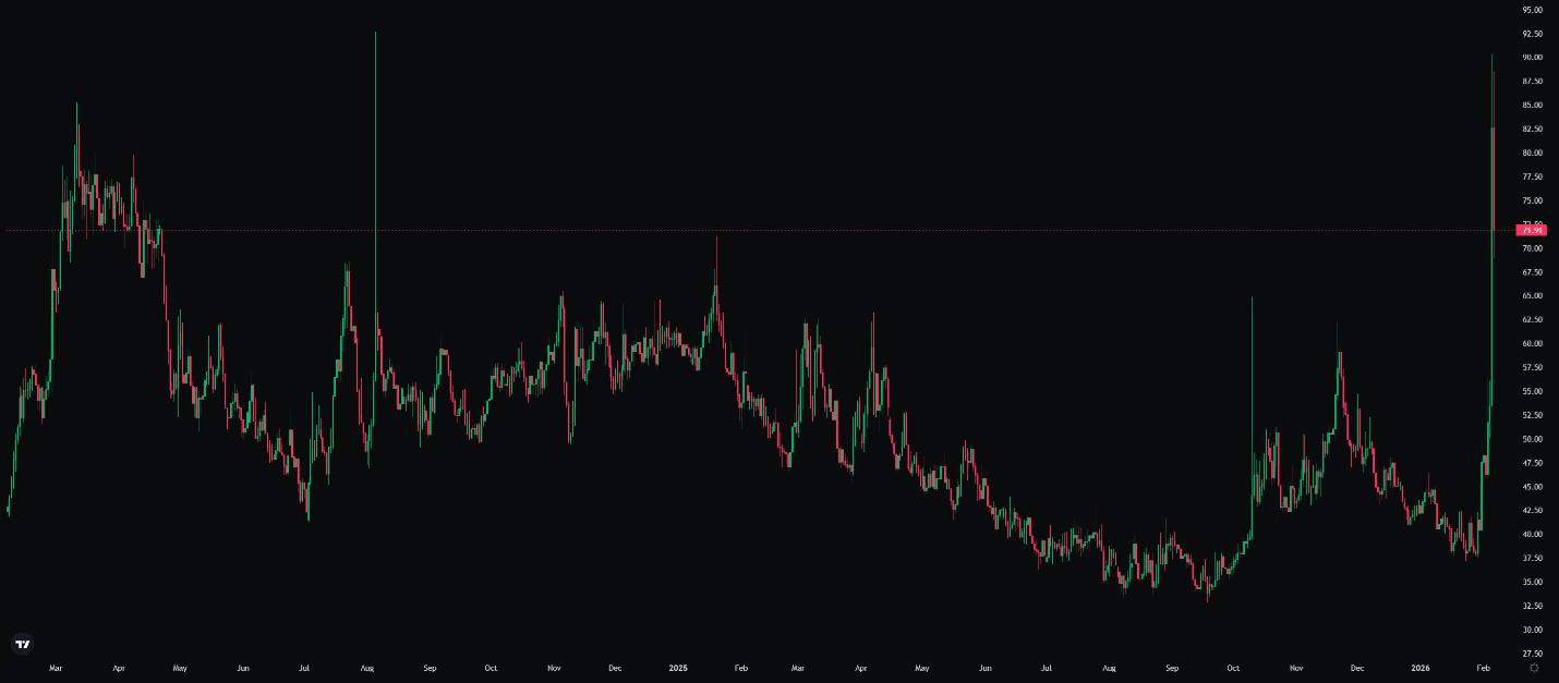 Precious metals experienced historic volatility this week. Gold fell 21% from near $5,600 to $4,404 on Monday, then recovered to ~$4,850 by Thursday. Silver dropped 41% from above $121 to $72, its largest percentage decline since March 1980.