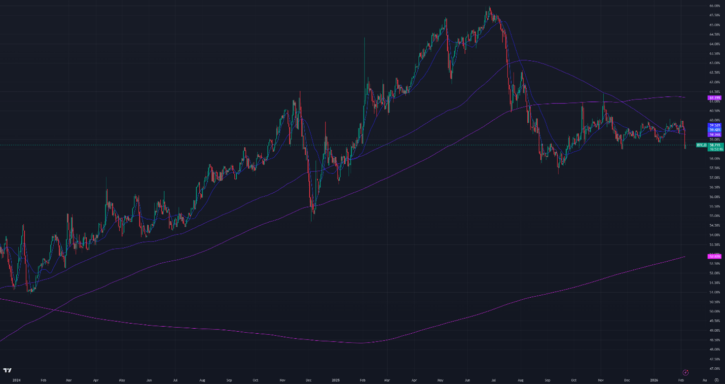 Figure 3: Bitcoin Dominance, Daily Candles, & Moving Averages; 2 years