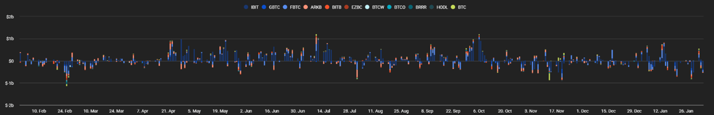 Figure 4: Bitcoin ETF Flows, Daily Bars; Source: The Block