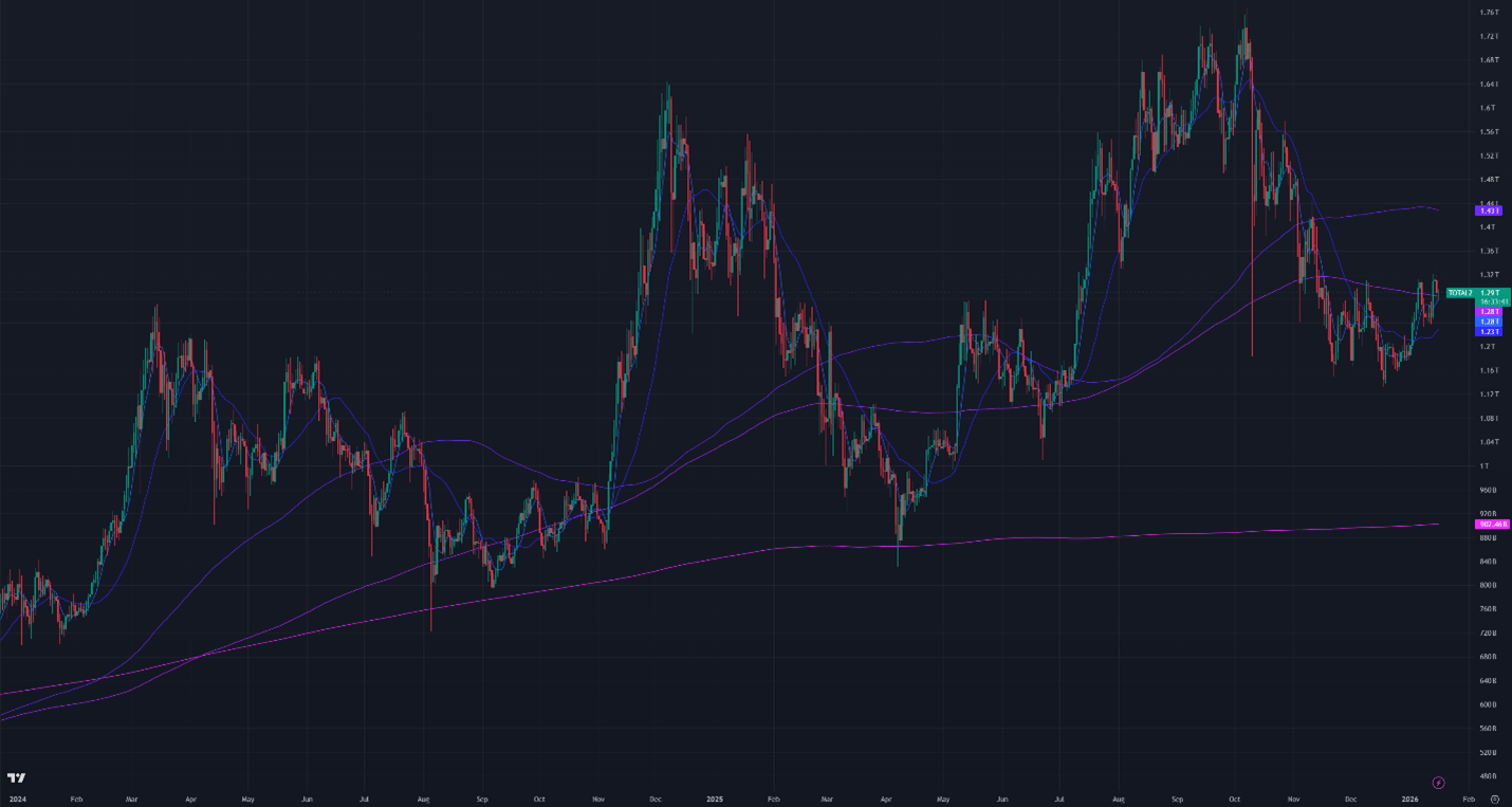 Figure 2: Crypto Market Cap Excluding Bitcoin, Daily Candles, & Moving Averages; 2 years