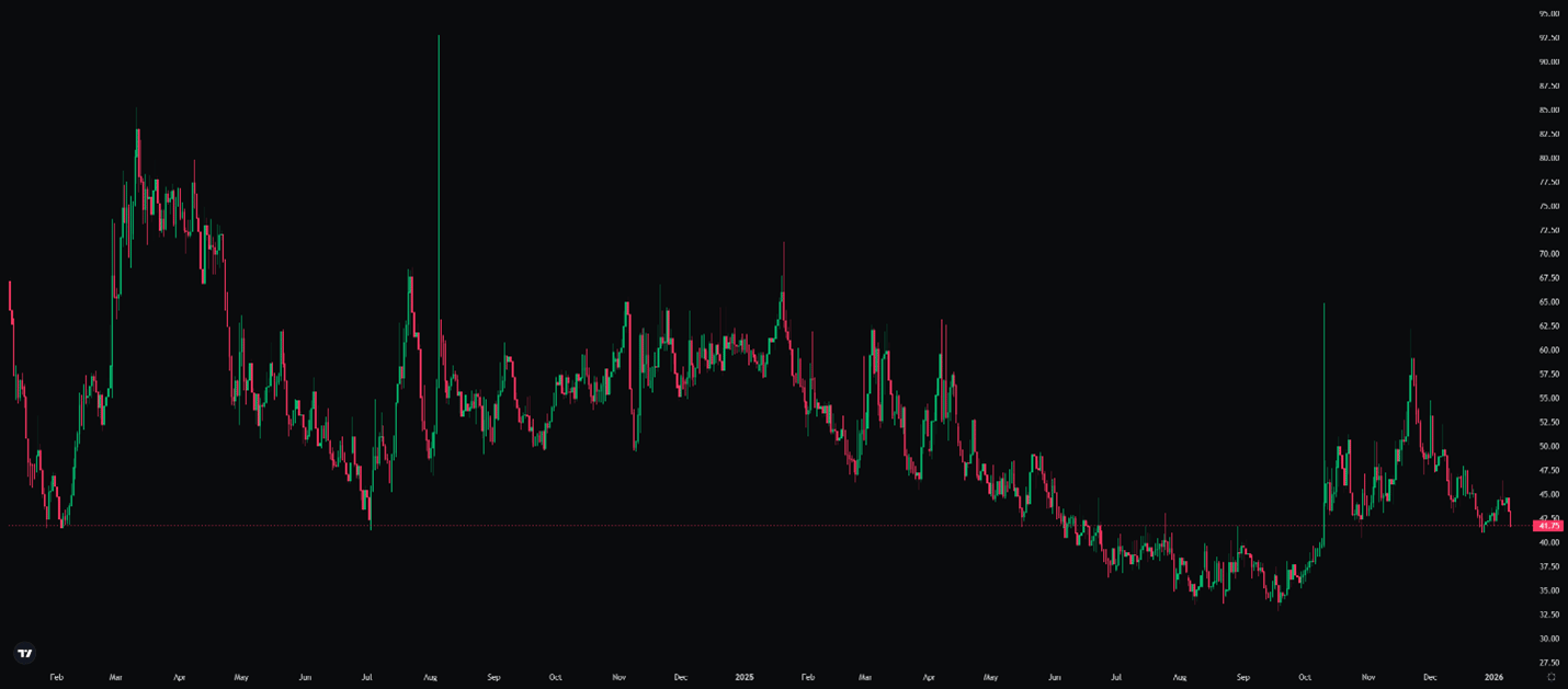 Bitcoin’s implied volatility (DVOL) remains near two-year lows despite this week’s price action. DVOL stands at 40.14%, down from 41.75% last week. Volatility briefly dipped to 38% before returning to the low 40% range. Since the October sell-off, DVOL has remained range-bound between the low 40% and low 50% levels.