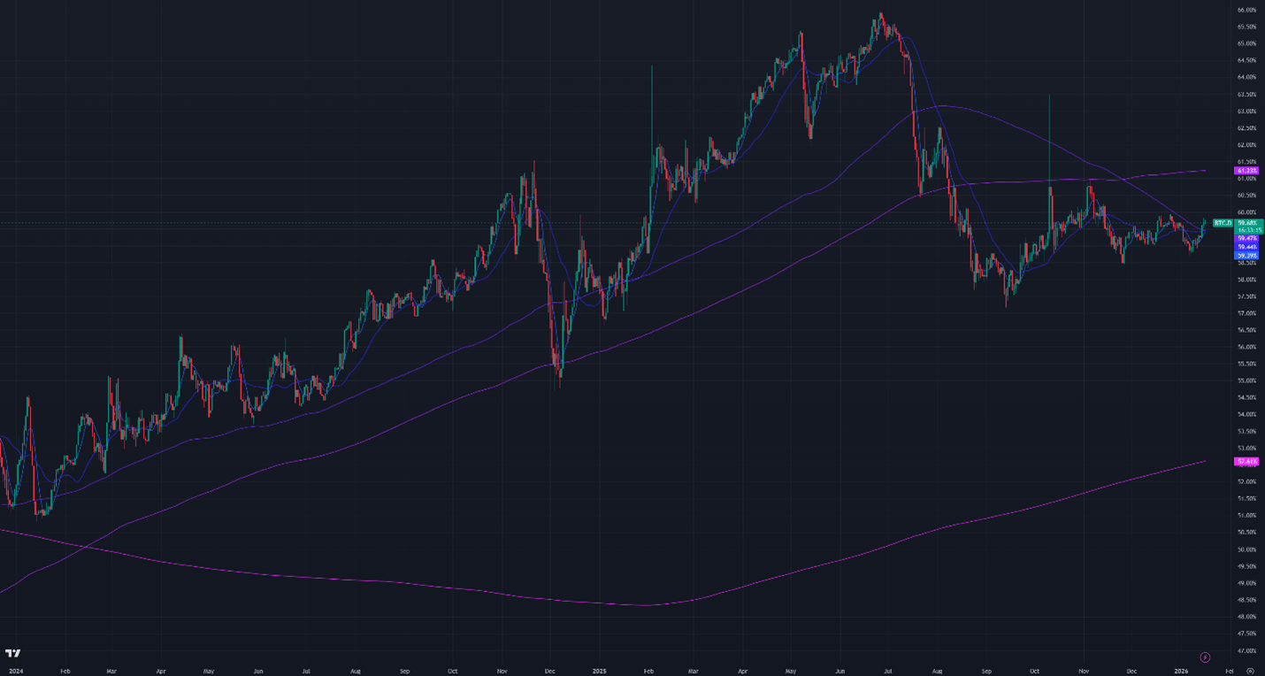 Figure 3: Bitcoin Dominance, Daily Candles, & Moving Averages; 2 years