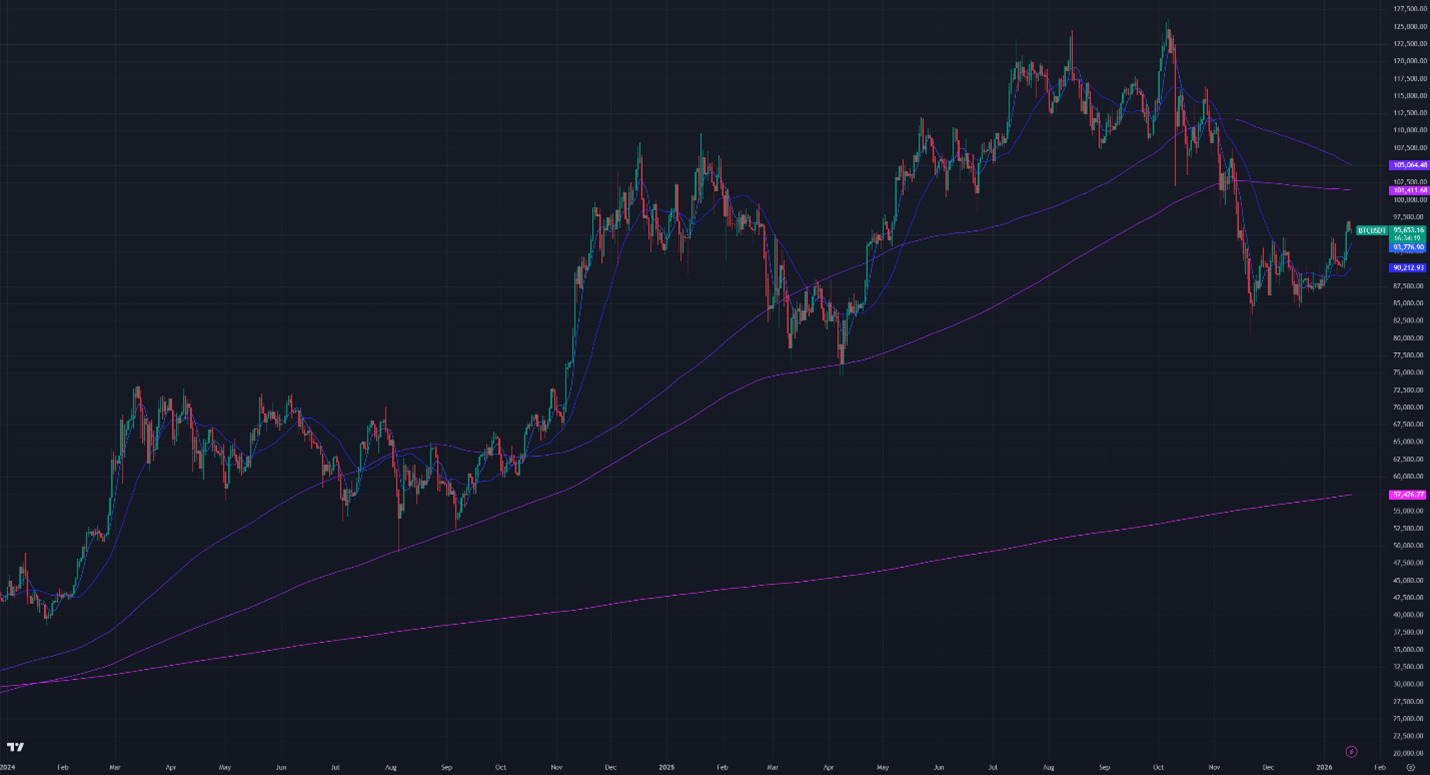 Bitcoin is trading above both short-term moving averages, the 7-day and 30-day MAs, for the first time since early December. Price remains below the longer-term 180-day and 360-day MAs, leaving the intermediate-term downtrend unchanged. Support levels below the current price are $91,000, $86,000, $80,000, $76,000, and $57,500.