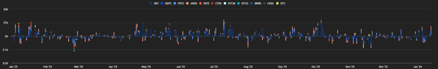 Net inflows totaled $1.56B this week, reversing the $1.1B in outflows recorded over three trading days earlier in January. Wednesday alone saw $840.6M in inflows, the largest single-day total of 2026 so far, offsetting the prior week’s outflows in one session.
