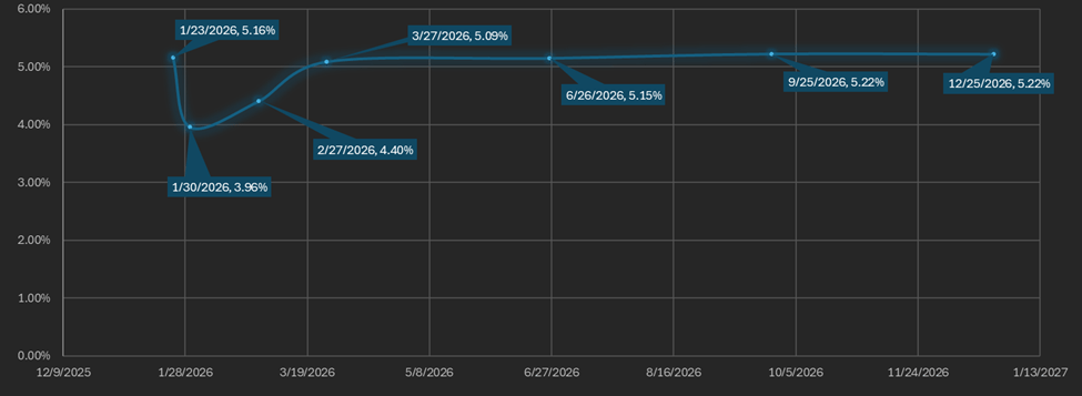 The futures curve is in normal contango, with the front month (January 30) trading below both the back month and later maturities. The spread between the lowest and highest yielding contracts remained compressed at 1.27%.