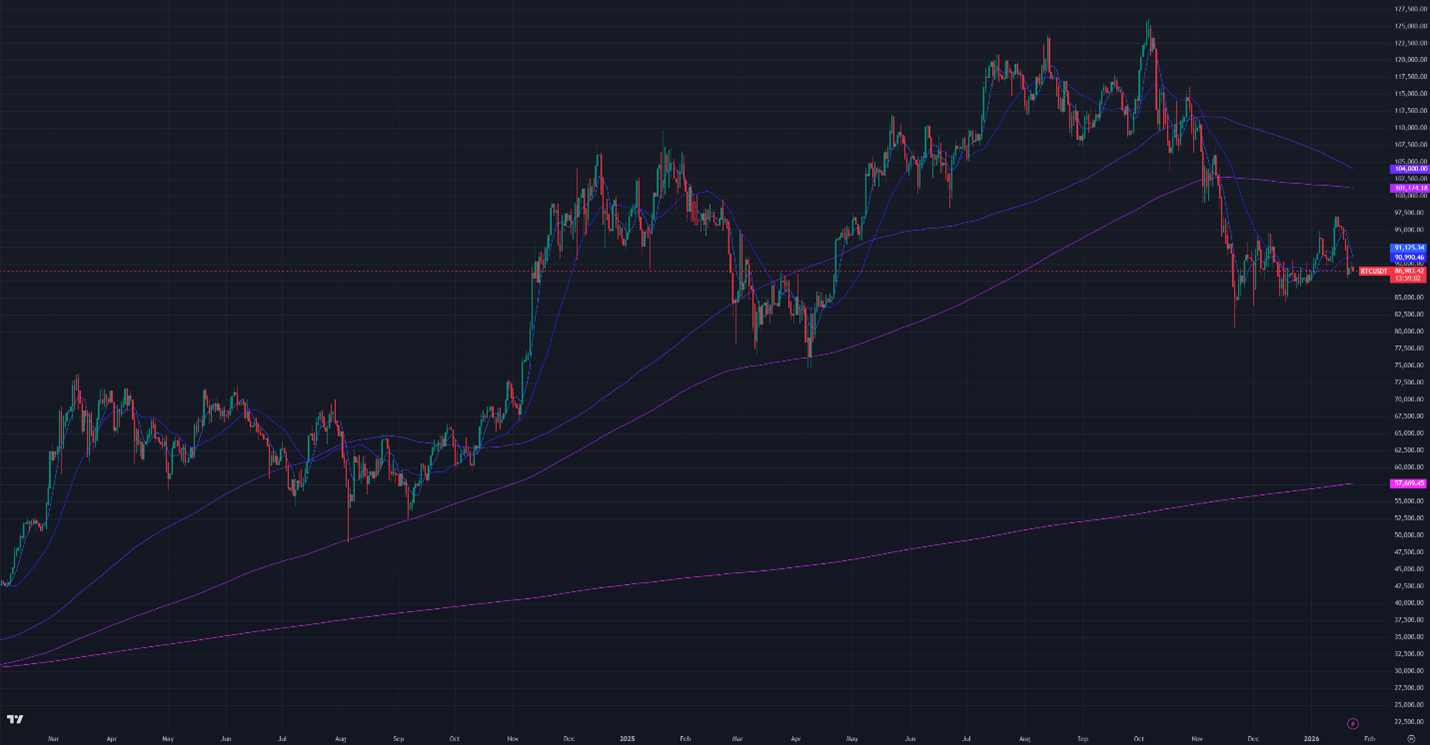 Bitcoin is currently trading near the short-term moving averages (7-day and 30-day). Price is currently in a downtrend, as it trades below the longer-term 180-day and 360-day moving averages. Key support levels below the current price are $86,000, $80,000, $76,000, and $57,500.