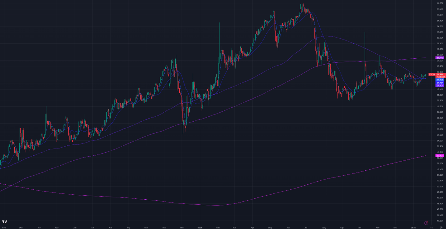 Figure 3: Bitcoin Dominance, Daily Candles, & Moving Averages; 2 years