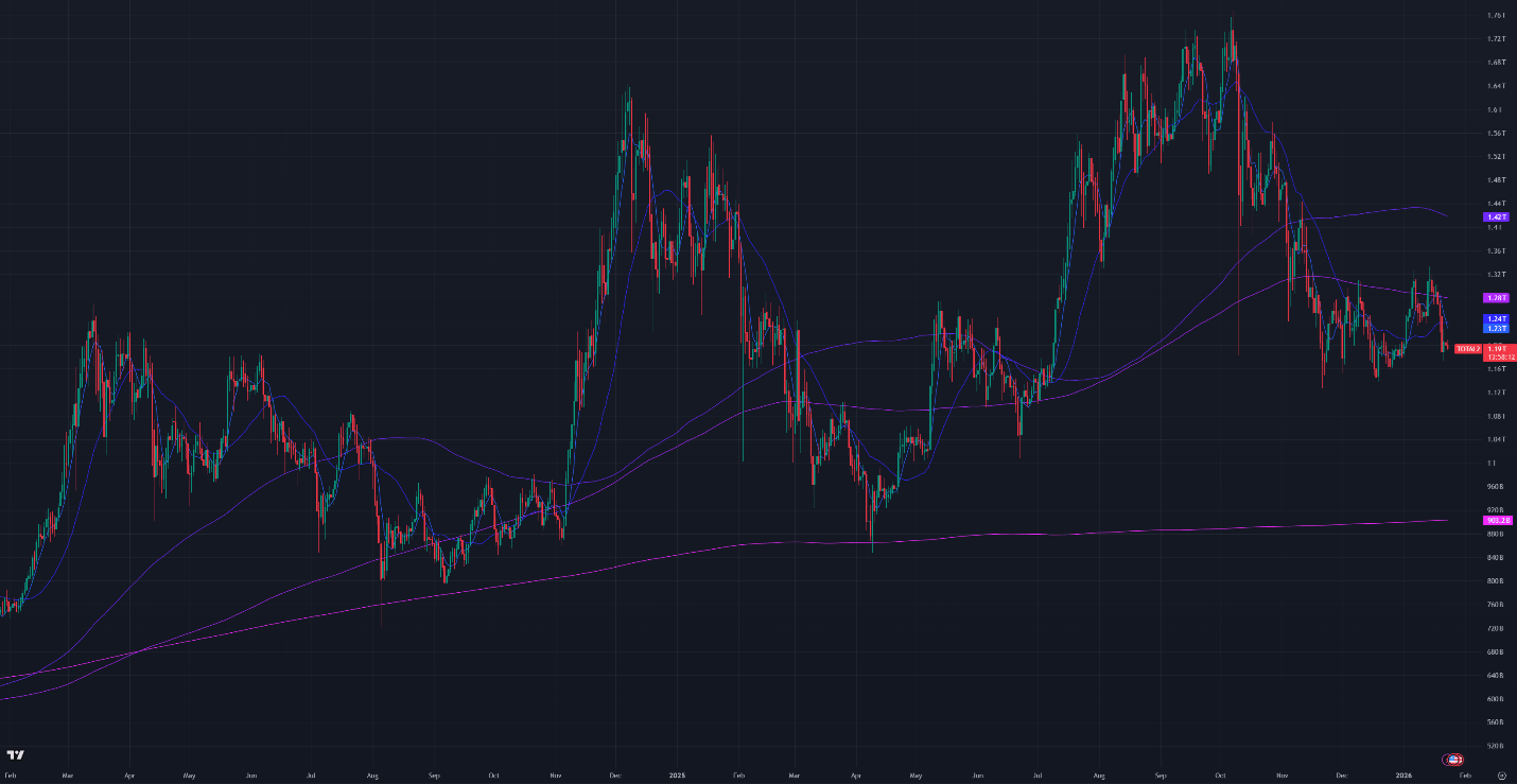 Figure 2: Crypto Market Cap Excluding Bitcoin, Daily Candles, & Moving Averages; 2 years