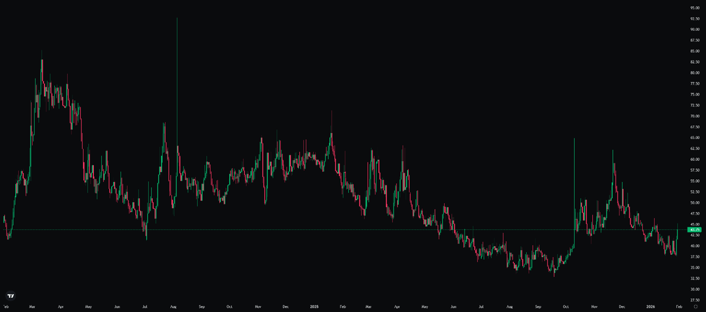 Since the October selloff, implied volatility has remained range-bound between the low 40% and low 50% levels within a broader downtrend. This week’s spike briefly moved above the upper end of that range before retracing. The move coincided with a higher VIX, consistent with a broader risk-off event.