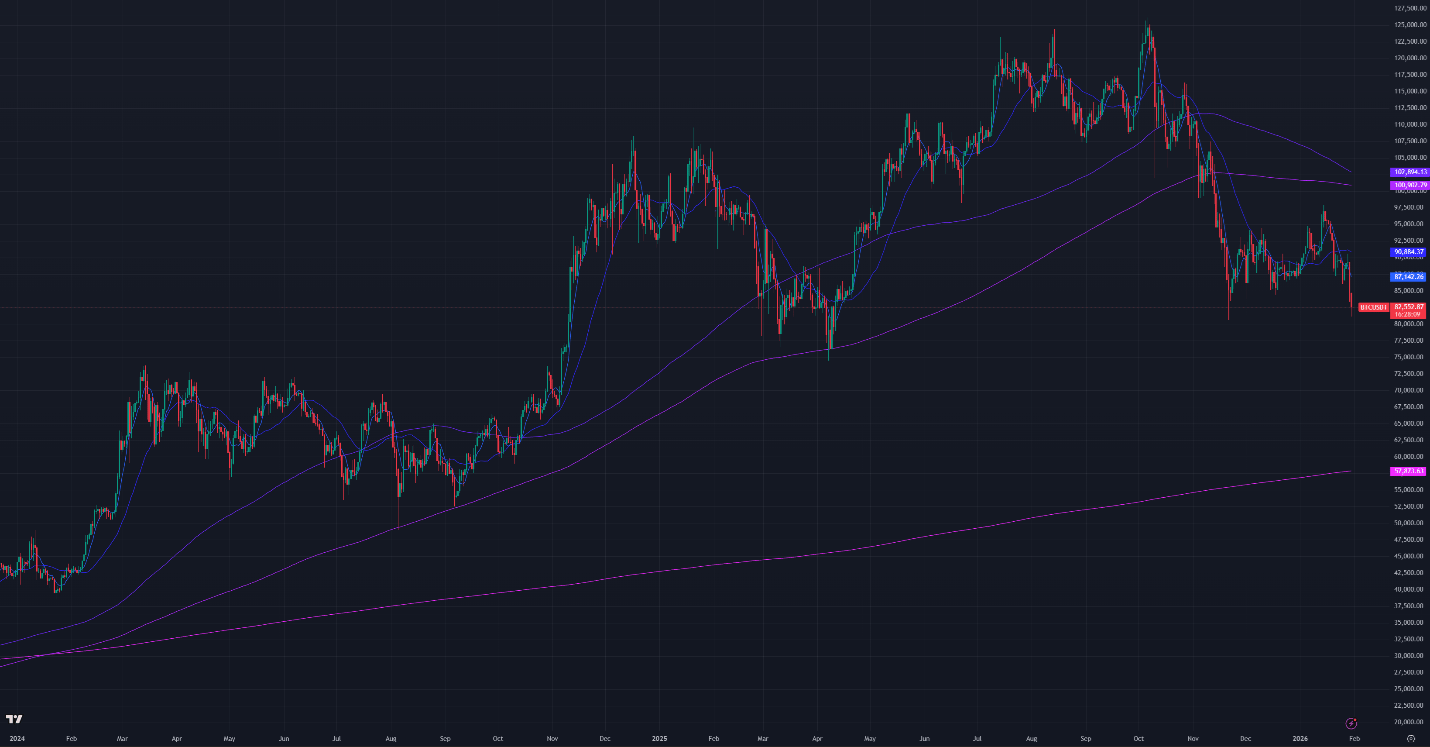 Bitcoin now trades below the 7-day and 30-day short-term moving averages (MAs). Price broke below the 100-week simple MA (~$85,000) for the first time since November. Bitcoin continues to trade well below the 180-day and 360-day MAs, maintaining a downtrend. Key support levels below the current price are $75,000, $70,000, and the 200-week MA near $58,000.