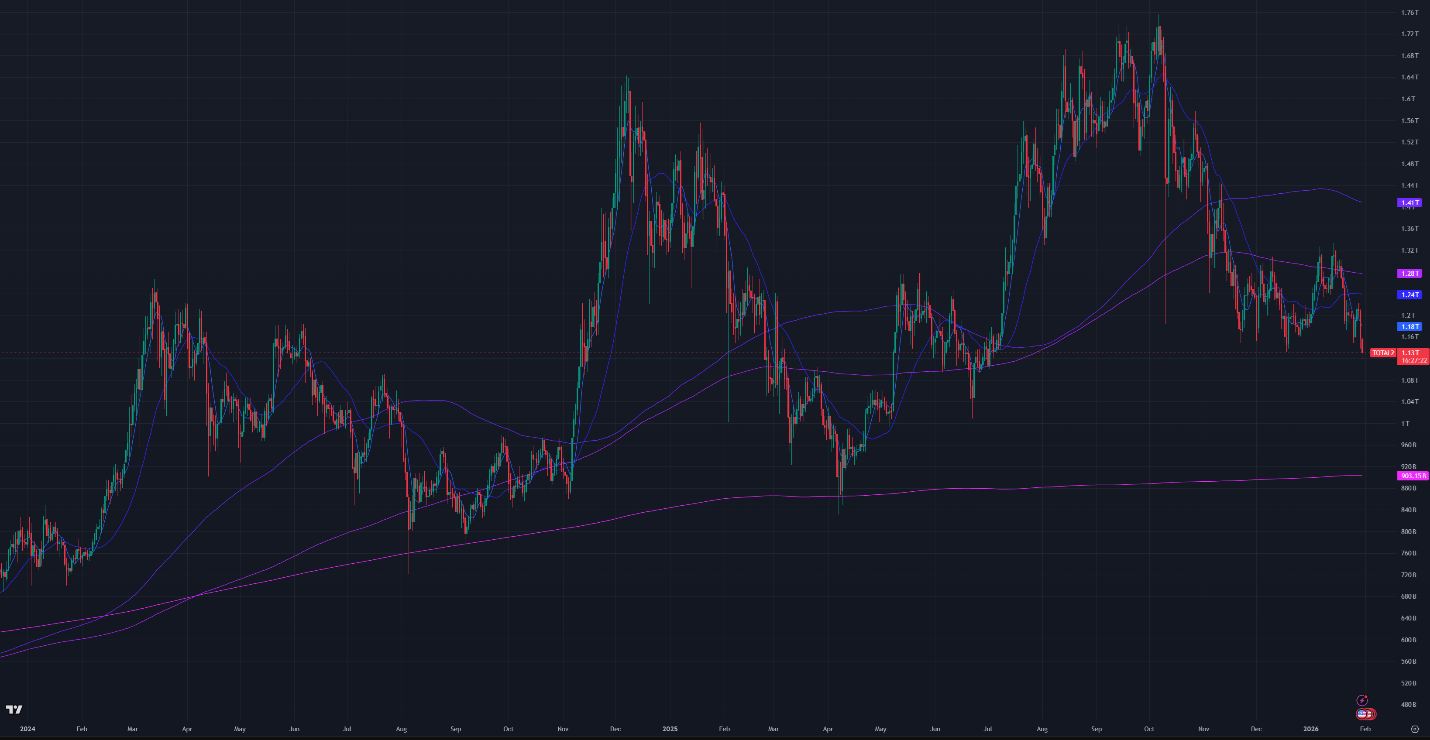 Figure 2: Crypto Market Cap Excluding Bitcoin, Daily Candles, & Moving Averages; 2 years