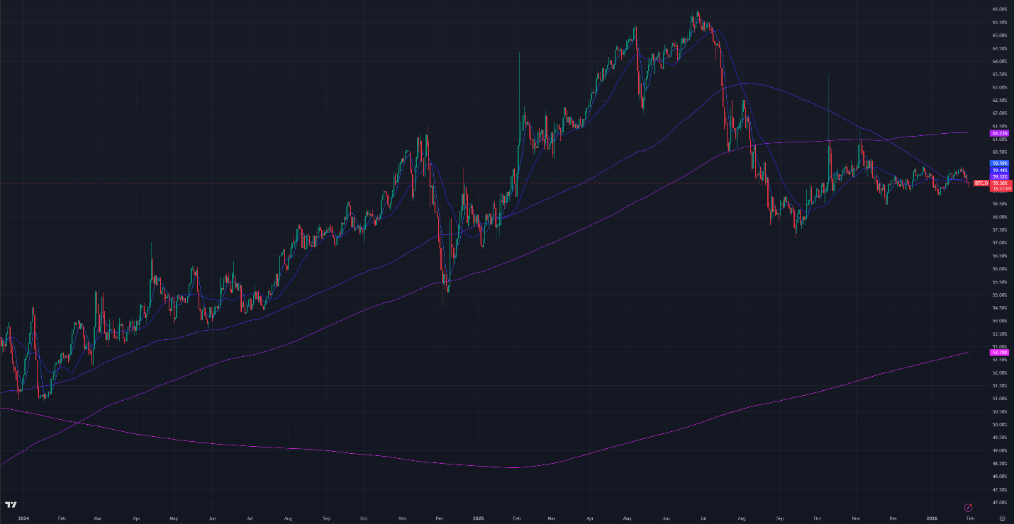 Figure 3: Bitcoin Dominance, Daily Candles, & Moving Averages; 2 years