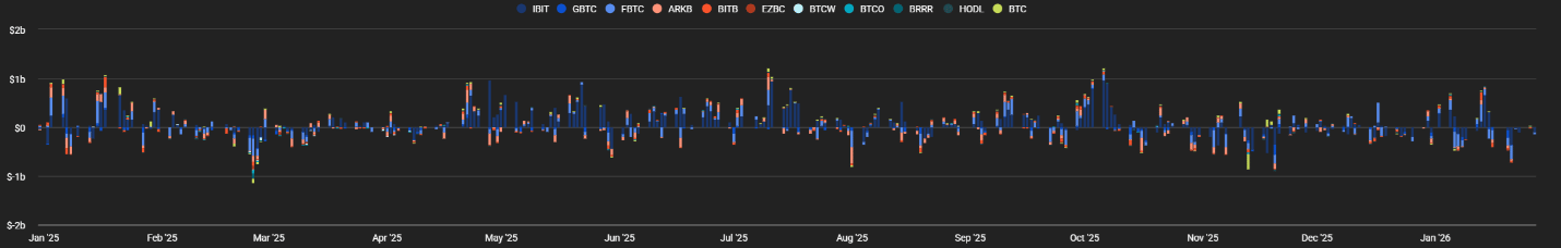 Net outflows totaled $1.082B over five consecutive days of redemptions. Outflows were concentrated in three products that accounted for about 92% of exits: Fidelity’s FBTC, Grayscale’s GBTC, and Ark’s ARKB. BlackRock’s IBIT was less impacted, but still recorded net outflows. Cumulative net inflows since launch are now roughly $55.5B, while total ETF assets declined to $115B, representing 6.7% of Bitcoin’s market cap.