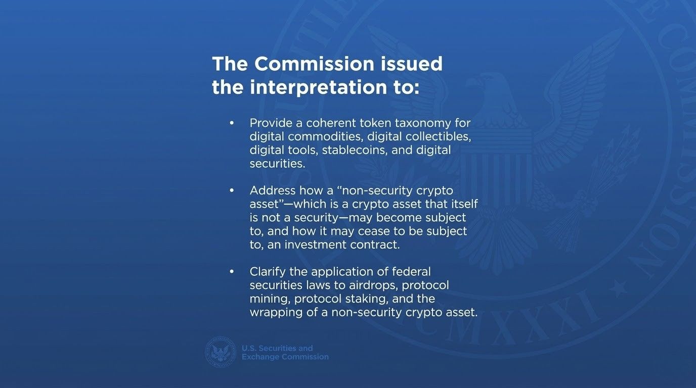 The March 17 release classifies digital commodities, collectibles, tools, and some payment stablecoins as non-securities. Mining, staking, one-for-one wrapping, and some airdrops do not, by themselves, amount to securities transactions.