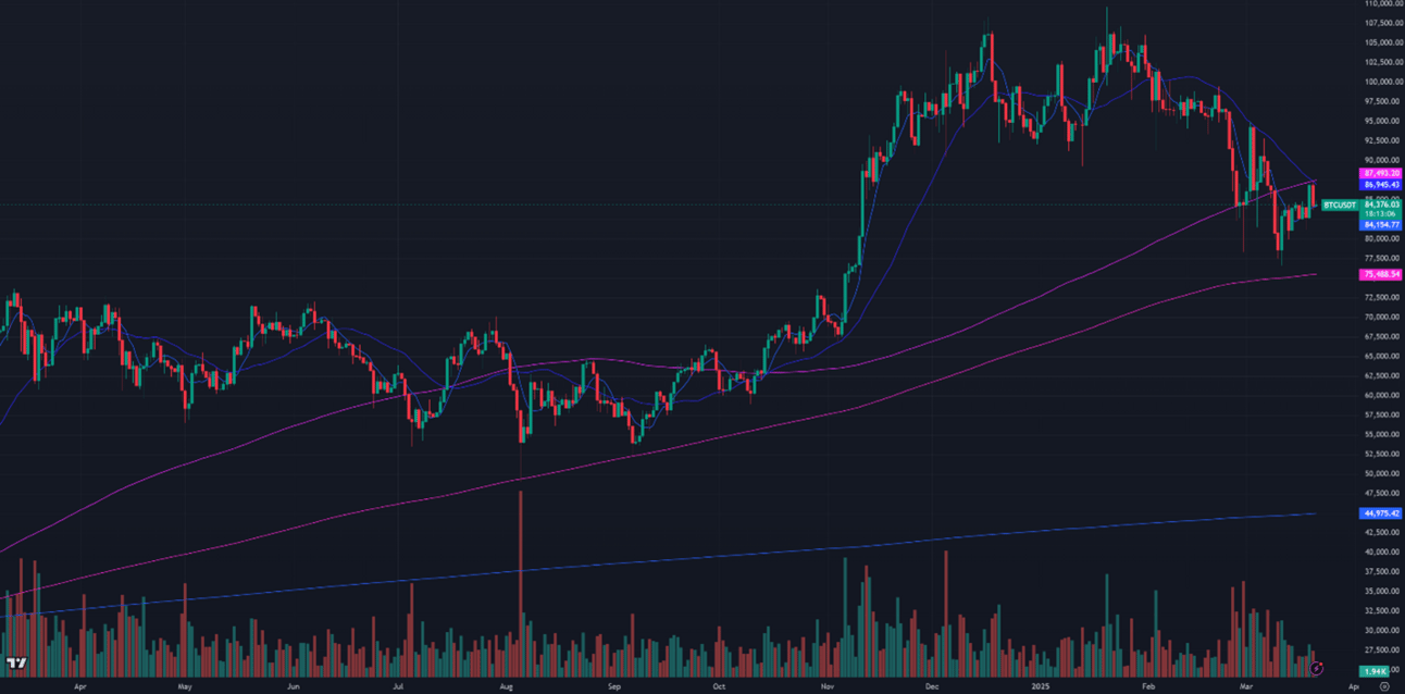 Figure 1: BTC Price, Daily Candles, & Moving Averages; 1 year; Source: Binance