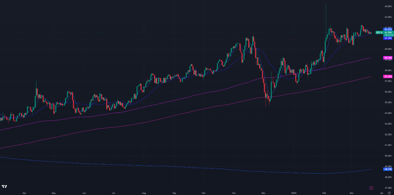 Figure 3: Bitcoin Dominance, Daily Candles, & Moving Averages; 1 year