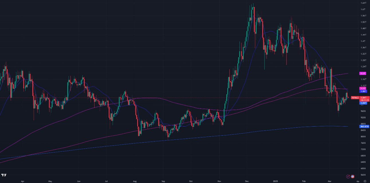 Figure 2: Crypto Market Cap Excluding Bitcoin, Daily Candles, & Moving Averages; 1 year