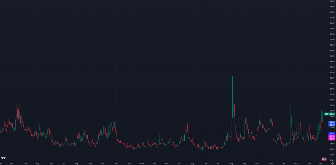 Equity market volatility has risen since the December 18th Federal Open Market Committee (FOMC) meeting, with notable spikes on January 13th, January 25th, and February 3rd, coinciding with key geopolitical and economic events. The volatility index (VIX) currently stands at 24.86, while the Treasury bond implied volatility index (MOVE) is at 108.95.