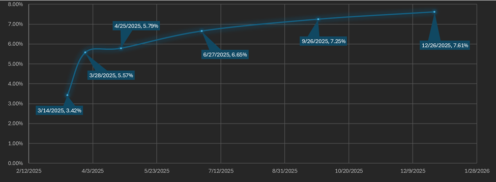The futures curve is in a normal upwards sloping contango with the front-week contract (March 14) yielding the lowest APR at 3.42%, while the longest-maturity contract (December 26) has the highest APR at 7.61%. Despite some distortions in curve shape, the overall structure is relatively flat. The spread between the lowest and highest-yielding maturities has widened to 4.19%, up from 0.79% last week.