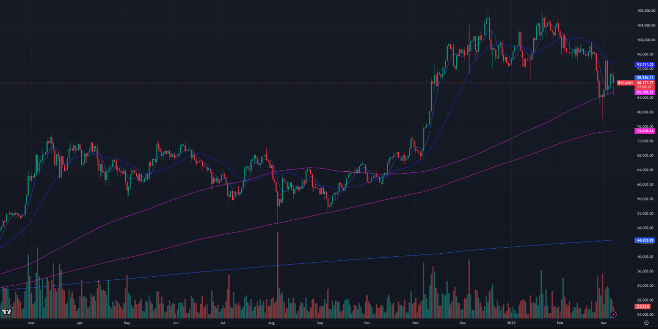 Bitcoin remains above the 1-year (360-day) and 200-week MAs, though the 1-year MA may be tested if the $88,000 level doesn't hold. A sustained reversal requires reclaiming both short-term MAs and the 1-year MA from below.