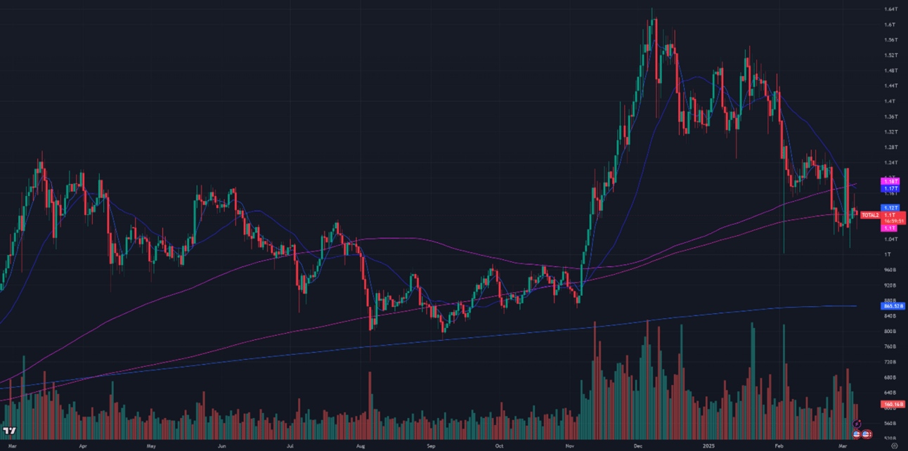 [Figure 2: Crypto Market Cap Excluding Bitcoin, Daily Candles, Moving Averages, & Volume; 1 year]