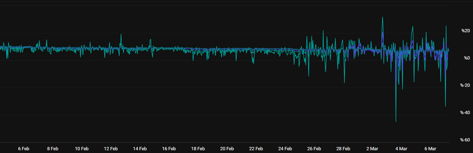 Bitcoin funding rates remained negative or flat, with the average basis spread dropping 2% to 6% since last Friday. Implied volatility surged from an eight-month low of 46.16% on February 24th to 62.66% by Tuesday. Altcoin market cap dipped from $1.05T to $1.01T.