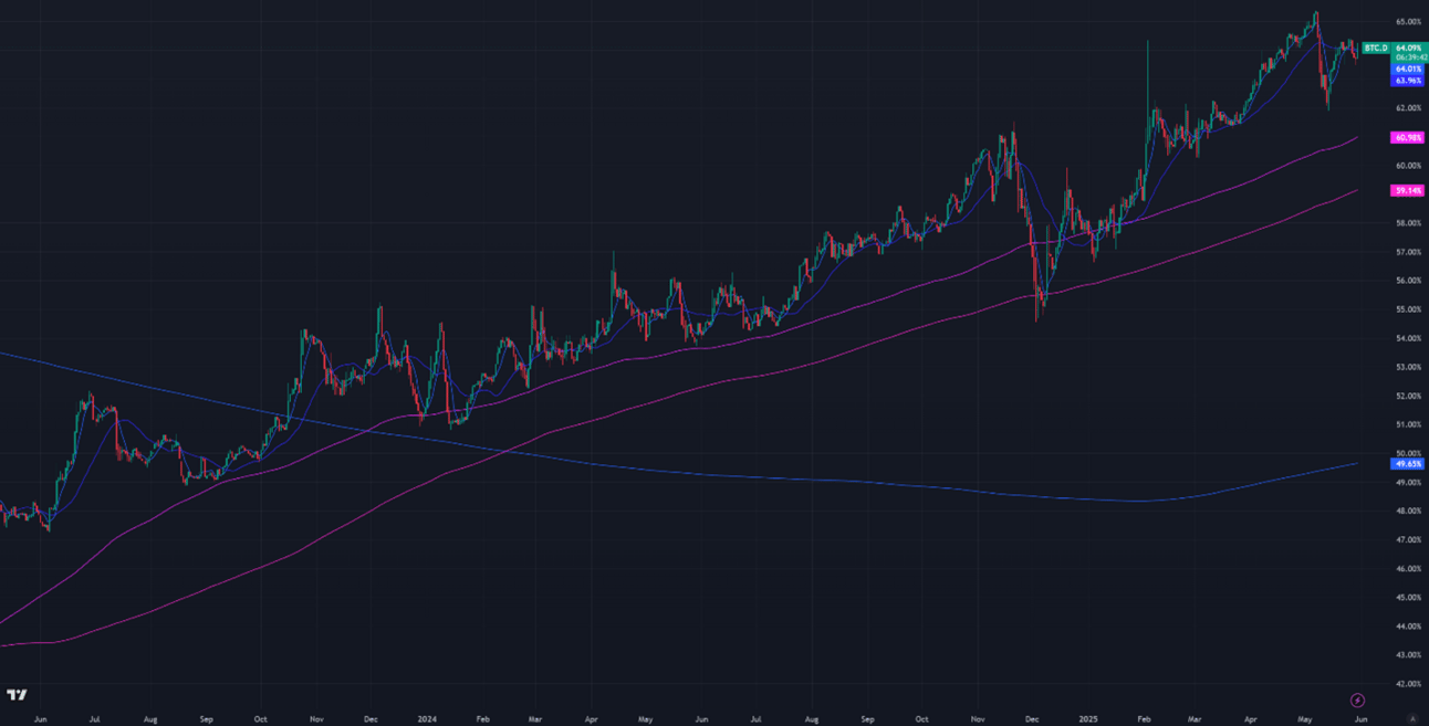 Figure 3: Bitcoin Dominance, Daily Candles, & Moving Averages; 2 years
