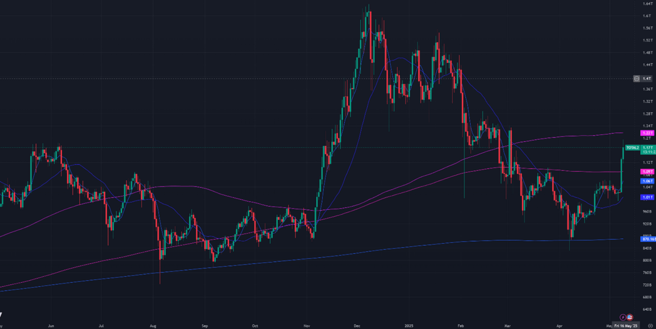 Figure 2: Crypto Market Cap Excluding Bitcoin, Daily Candles, & Moving Averages; 1 year