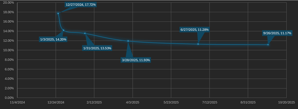 The futures curve is in an inverted contango from the front month contract (December 27th) onward. The basis falls continuously from the front month to September 2025’s maturity in a smooth curve. There is about a 6.55% difference between the lowest and highest yielding maturities, down from 2% last week.