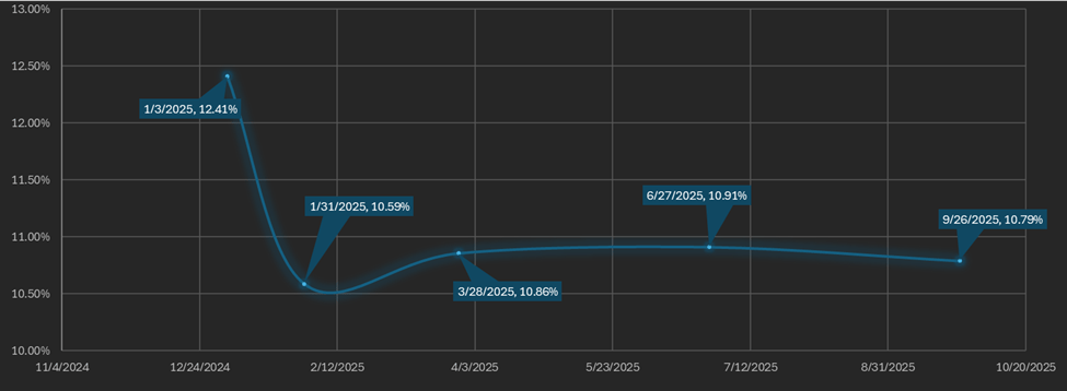 The futures curve is in an inverted contango from the front week contract (January 3rd) onward. The curve dips sharply from front week to front month and then largely flat over the rest of the curve. There is about a 1.82% difference between the lowest and highest yielding maturities, down from 6.55% last week.
