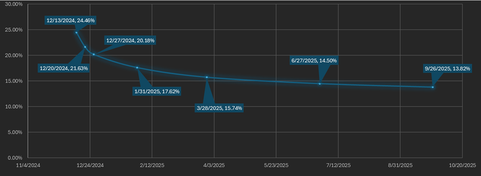 The futures curve is in an inverted contango from the week (December 13th) onward. The basis falls continuously from the front week to September 2025’s maturity in a smooth curve. There is about an 11% difference between the lowest and highest yielding maturities. The future’s curve has steepened in the last week as the spread between maturities has expanded from a recent low of 5% last week.