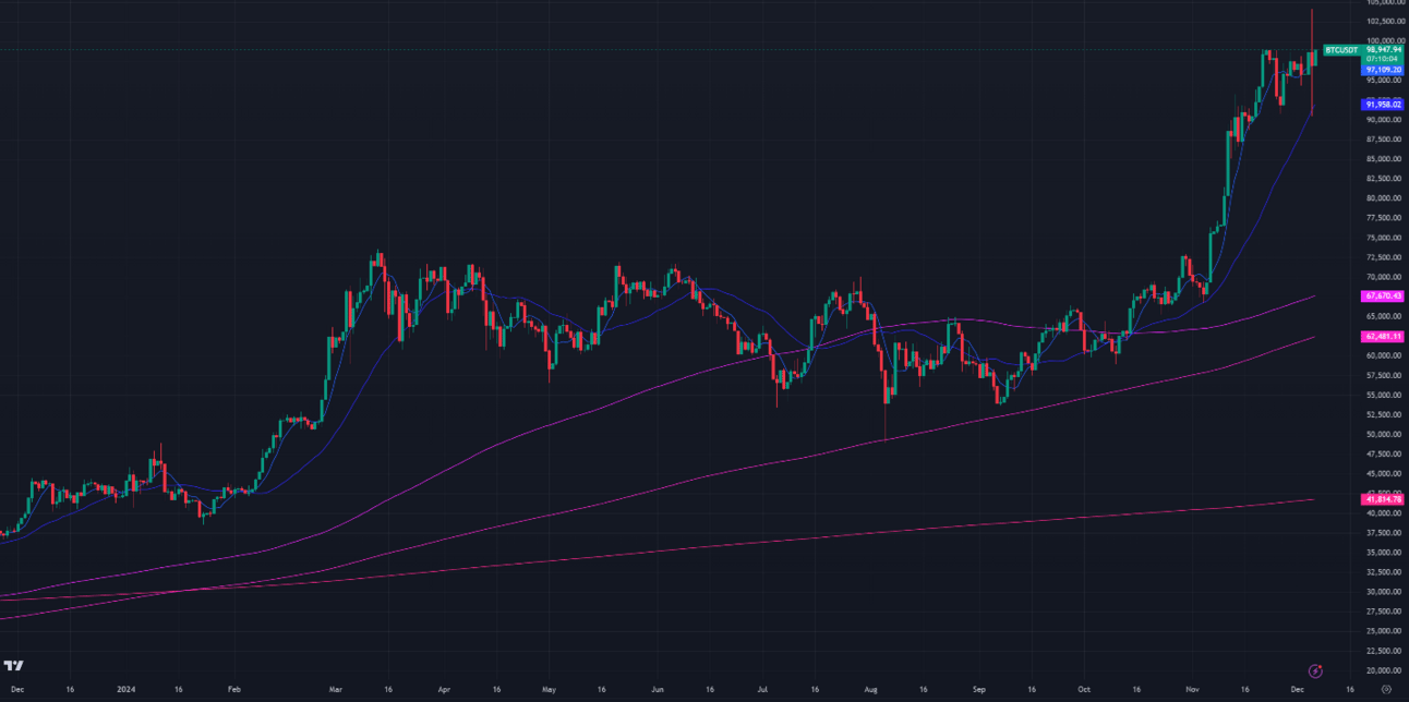 Bitcoin continues its uptrend, having briefly surpassed the $100,000 mark on Thursday morning. However, the breakout failed, causing a sharp drop to $91,000 by the evening. As of now, Bitcoin is trading just below $100,000 at $98,948.