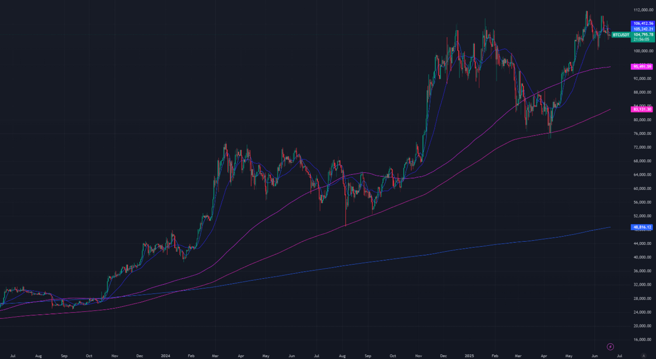 Figure 1: BTC Price, Daily Candles, & Moving Averages; 2 years; Source: Binance