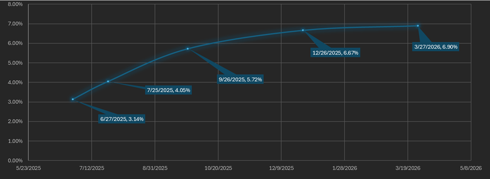 The futures curve is in normal contango, with the front-week contract (June 27th) yielding 3.14%, the lowest on the curve, and maturities rising steadily through the March 2026 contract at 6.9%. The spread between the lowest and highest yielding maturities narrowed to 3.77%, down from 5.43% last week.