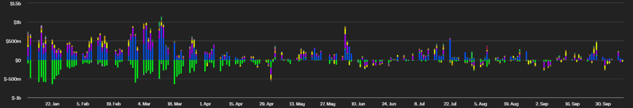 Average daily flows were $24.1 million. Flows were positive last Friday and Monday but fell slightly the rest of the week, triggered by falling prices. ETF flows tend to move in response to price moves rather than cause them.