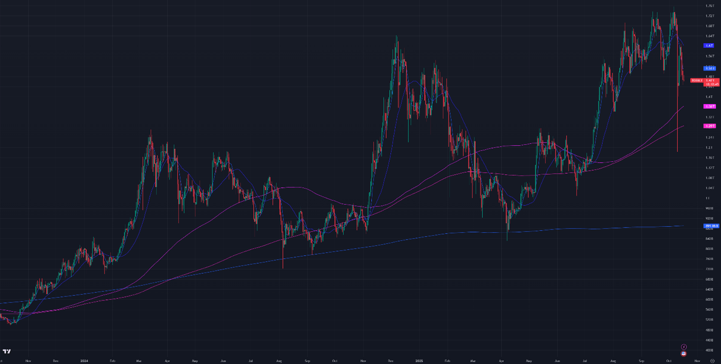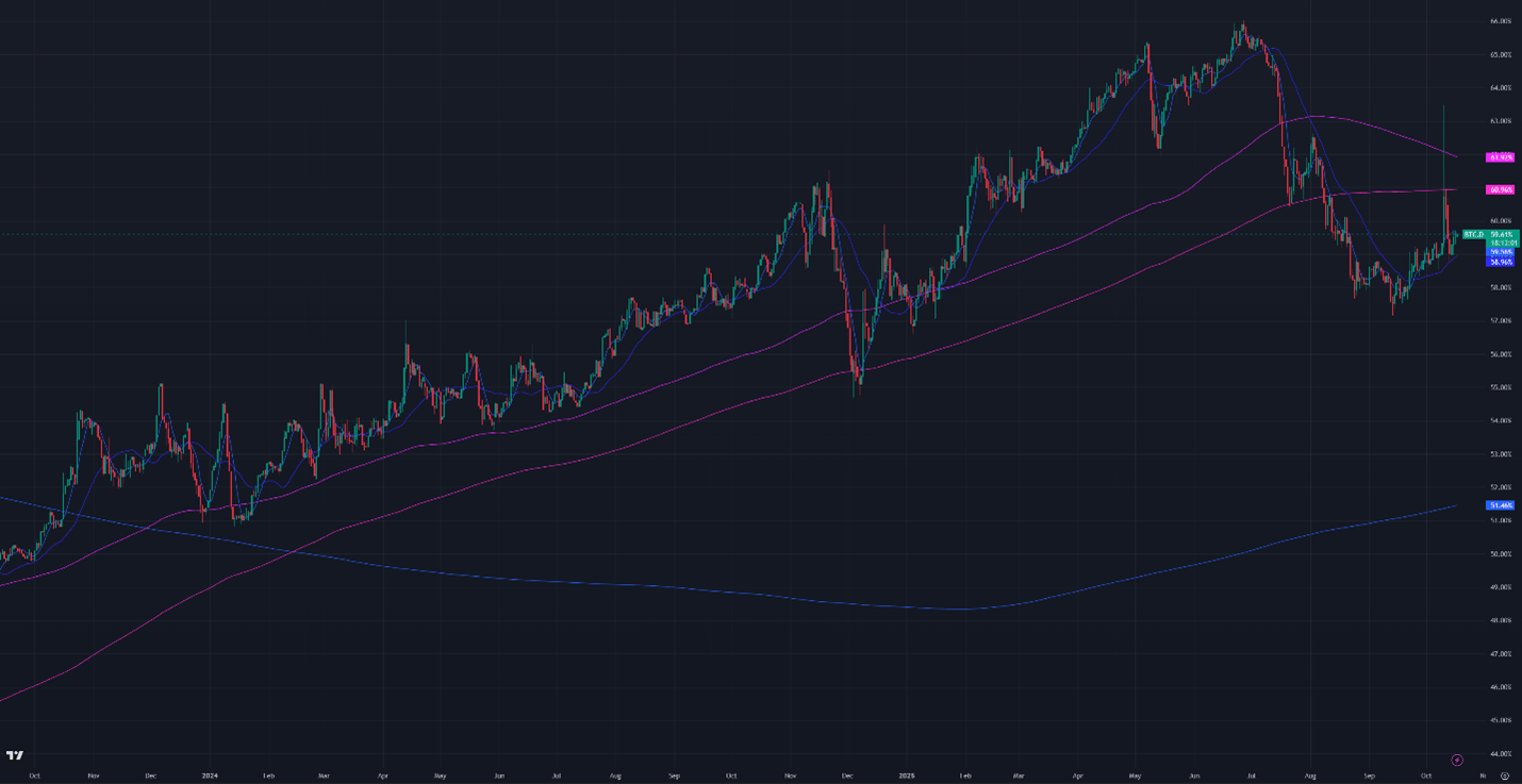 Bitcoin dominance gained 0.33% for the week and 3.03% intraweek during the crash. Altcoin market caps dropped from $1.66T to $1.47T, hitting an intra-month low of $1.18T on Friday.