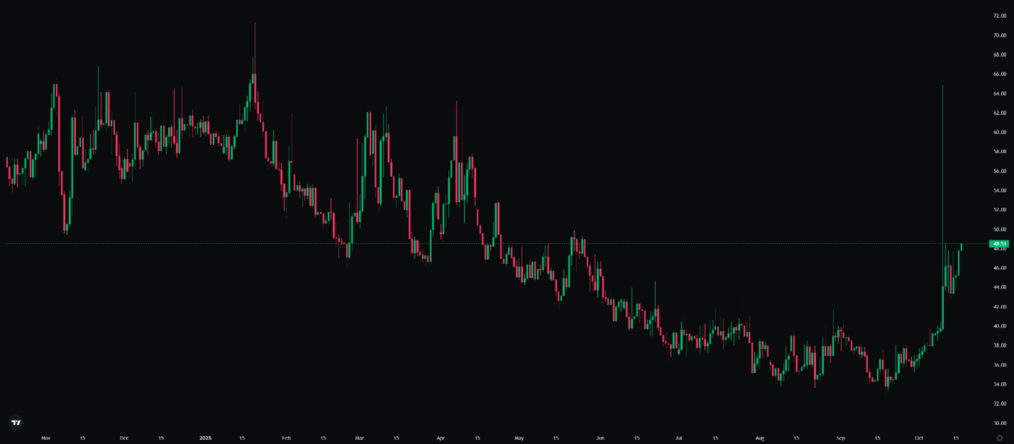 The largest single liquidation event in crypto history occurred on Friday, October 10th, with $19 billion liquidated in under 24 hours. Spot Bitcoin prices collapsed 15% in less than seven hours, while altcoins suffered even heavier losses. Ethereum fell 21% and Solana 24% on Binance, while order books in less liquid coins such as Cosmos (ATOM) were wiped out, briefly pushing prices to zero.