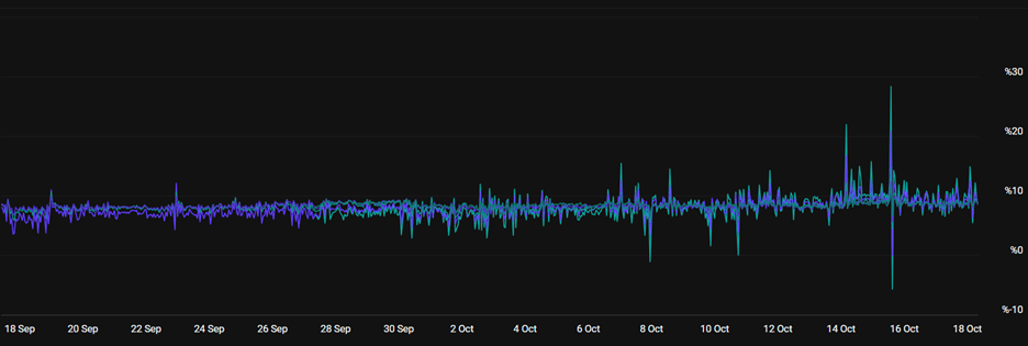 The futures curve is showing an inverted contango starting from the front month (October 25th) onward. The annualized percentage return (APR) for the October 25th contract is higher than for all other maturities. The basis spread declines through June 2025, then slightly increases by September 2025. The difference between the lowest and highest yields across maturities is about 3%, but if the front month (October 25th) is excluded, the variation shrinks to less than 1%. This is the most bullish futures curve we've seen since early Q1 of this year.